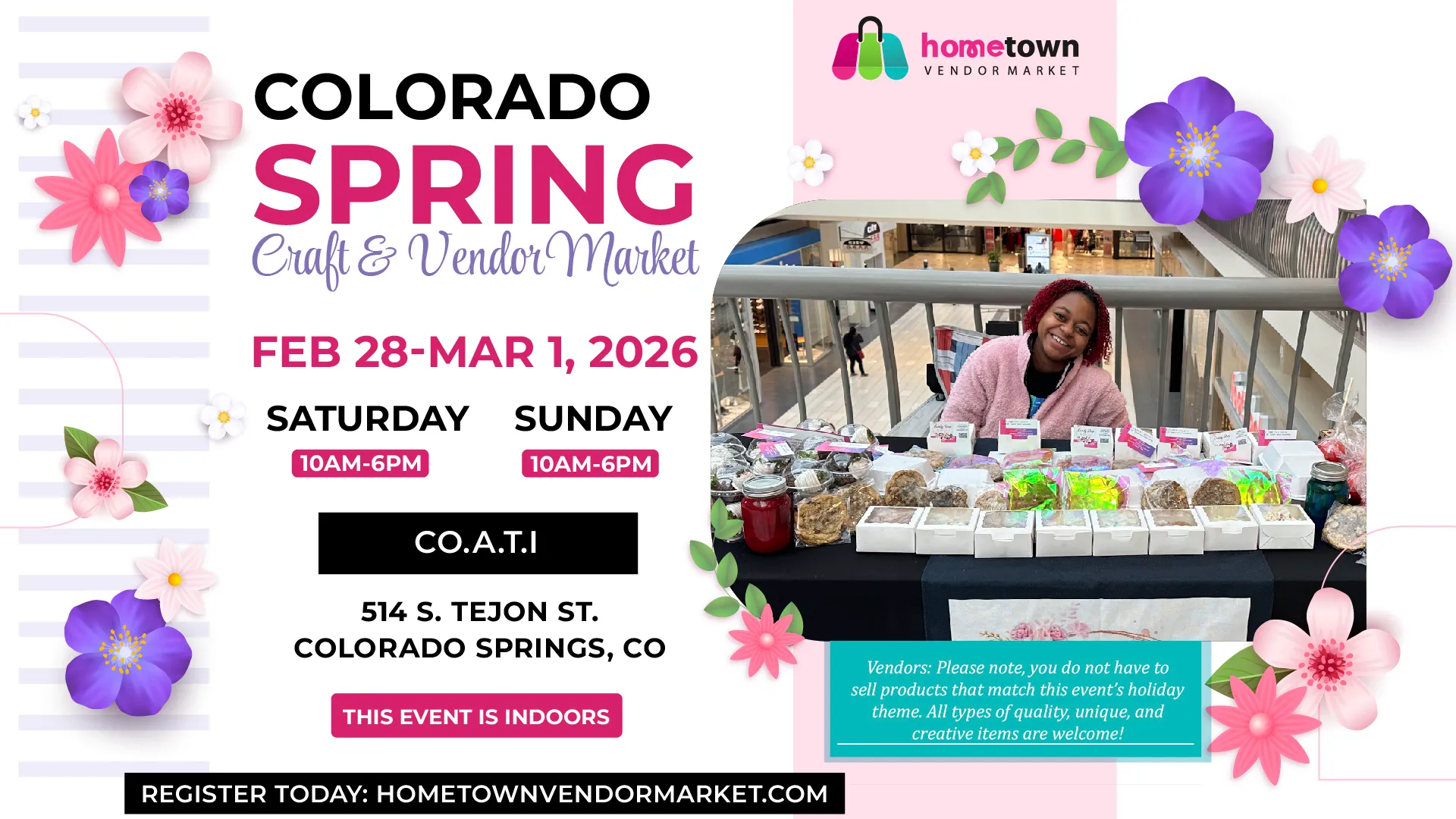 COLORADO february 28 – march 1, 2026 February 28 – march 1, 2026 | inDOORS Colorado Springs Spring Craft & Vendor Market CO.A.T.I, 514 S. Tejon St., Colorado Springs, CO Apply now