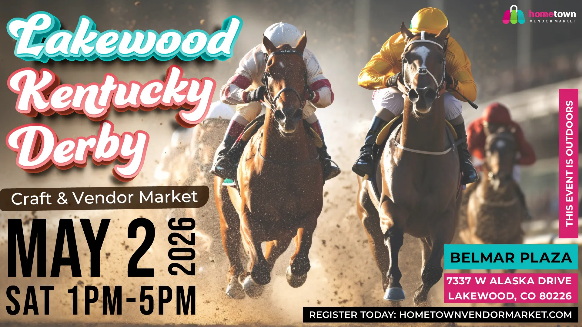 COLORADO may 2, 2026 may 2, 2026 | outDOORS Lakewood Kentucky Derby Craft & Vendor Market Belmar Plaza, 7337 W Alaska Drive, Lakewood, CO 80226 Apply now